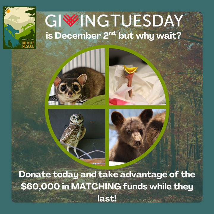 Help drive our mission of protecting the future of local wildlife by making a monthly or one time tax-deductible donation to Gold Country Wildlife Rescue. Your donation supporting GCWR’s wildlife conservation work will make a true difference in the lives of wildlife that we rescue, rehabilitate, and release back into the wild.